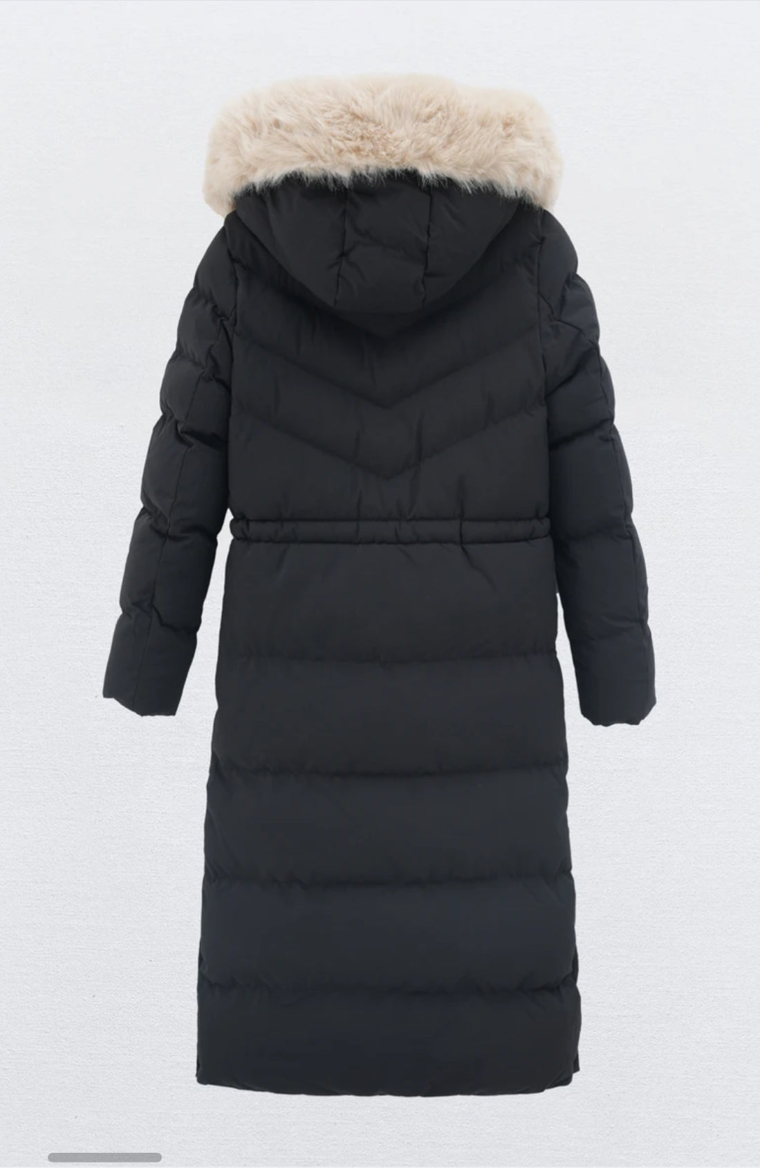 Hold dig varm og stilfuld hele vinteren med denne elegante lange dunjakke. Jakken har en aftagelig hætte med eksklusiv pelskant, lange ærmer med ribkanter, samt justerbar talje med snøre, så du kan forme pasformen efter behov.