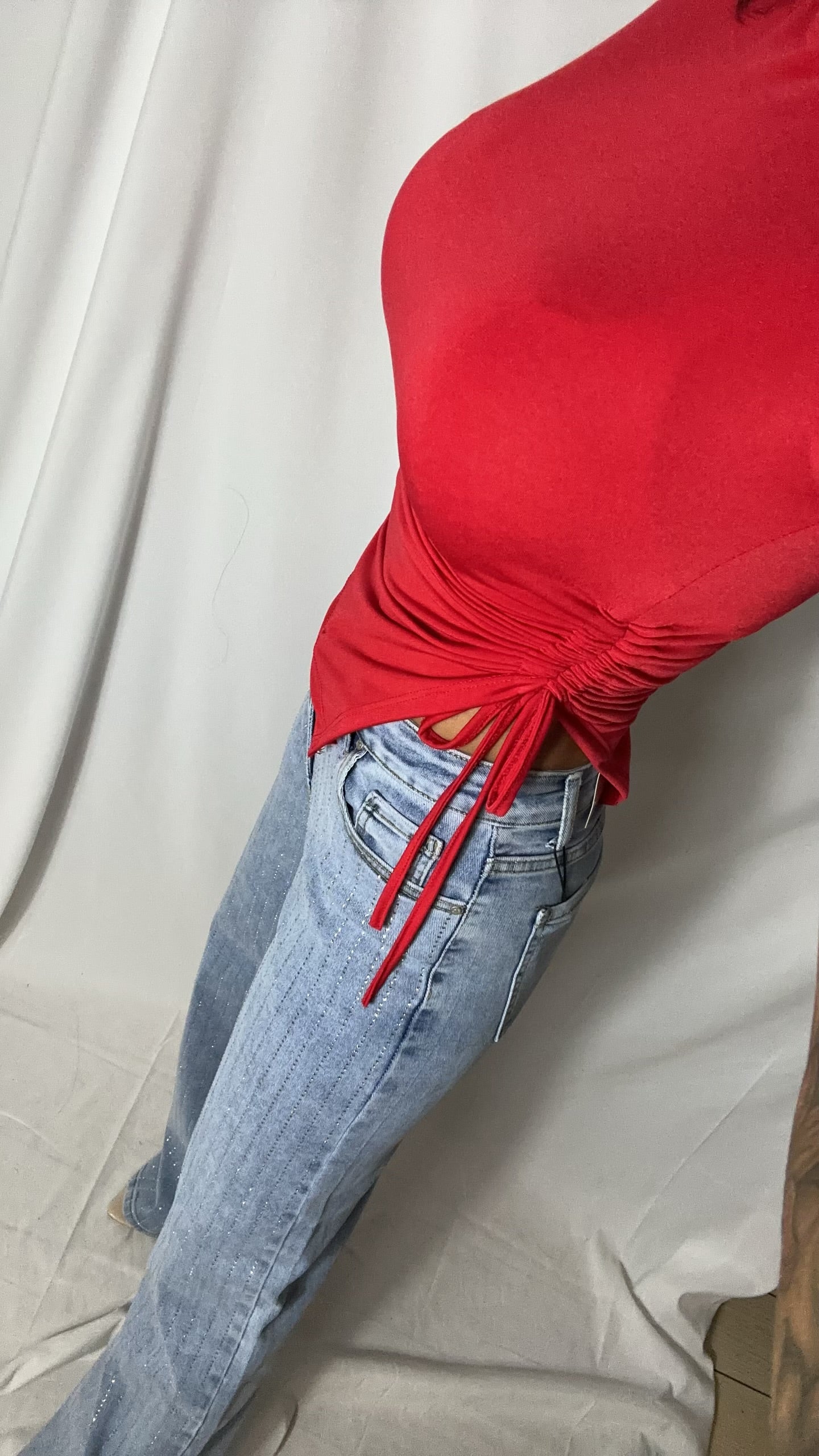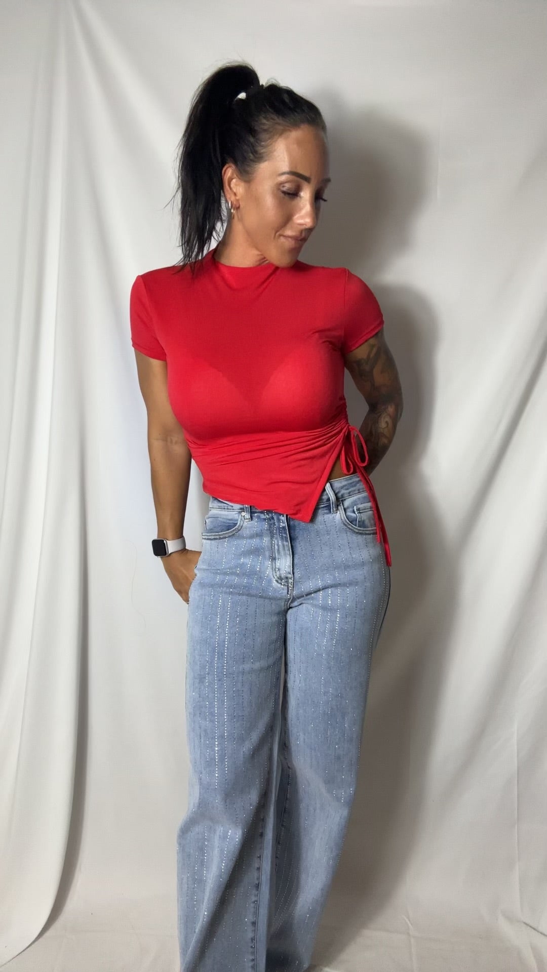 Med sit enkle men moderne design er T-shirten ideel til kølige efterårsdage og kan styles både til hverdag og mere festlige lejligheder.