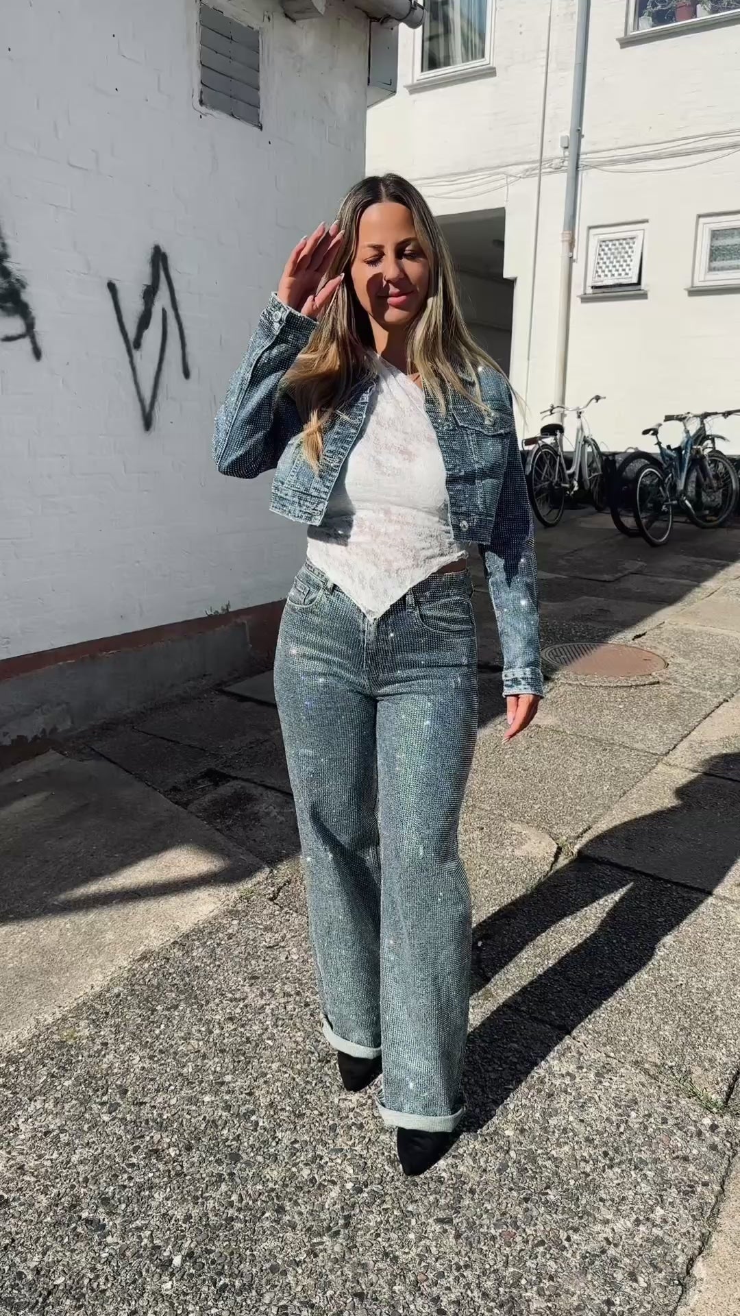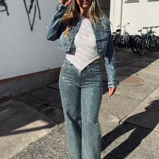 Disse trendy mørke denim bukser med glitter er perfekte til festlige anledninger og aftener hvor du vil skille dig ud. Det glamourøse sparkle design giver et unikt og iøjnefaldende look, mens den komfortable denim sikrer god pasform og bevægelsesfrihed.
