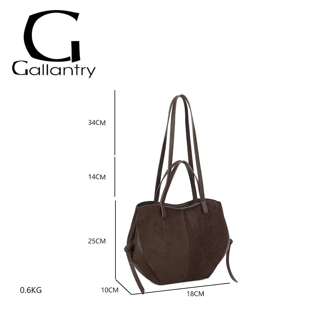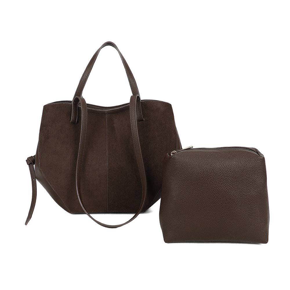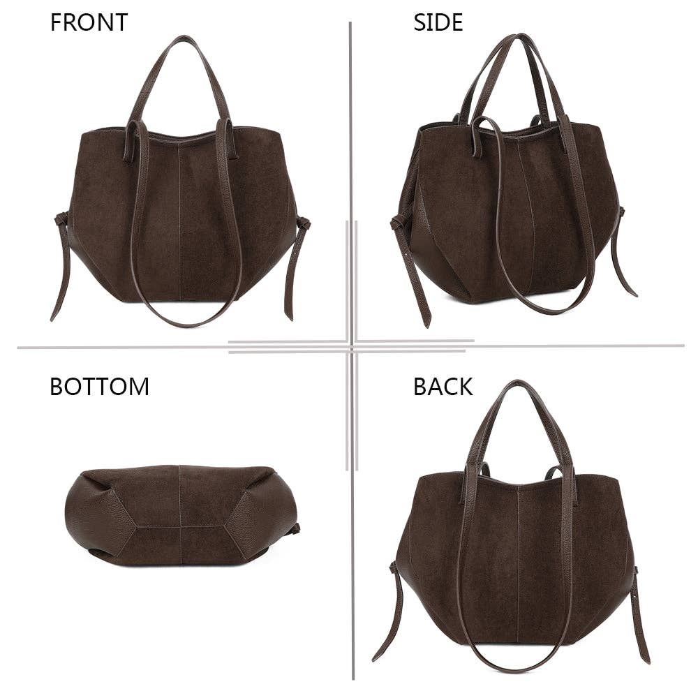 Elegant og tidløs, Elyne-håndtasken forfører med sin subtile blanding af blød ruskind og præget materiale, der tilbyder en stil, der både er naturlig og sofistikeret. Dens varme taupe nuance passer nemt til alle outfits, fra hverdagsbrug til mere formelle lejligheder. Rummelig og praktisk, den leveres med en aftagelig indvendig lomme, ideel til at holde dine nødvendigheder godt organiseret.