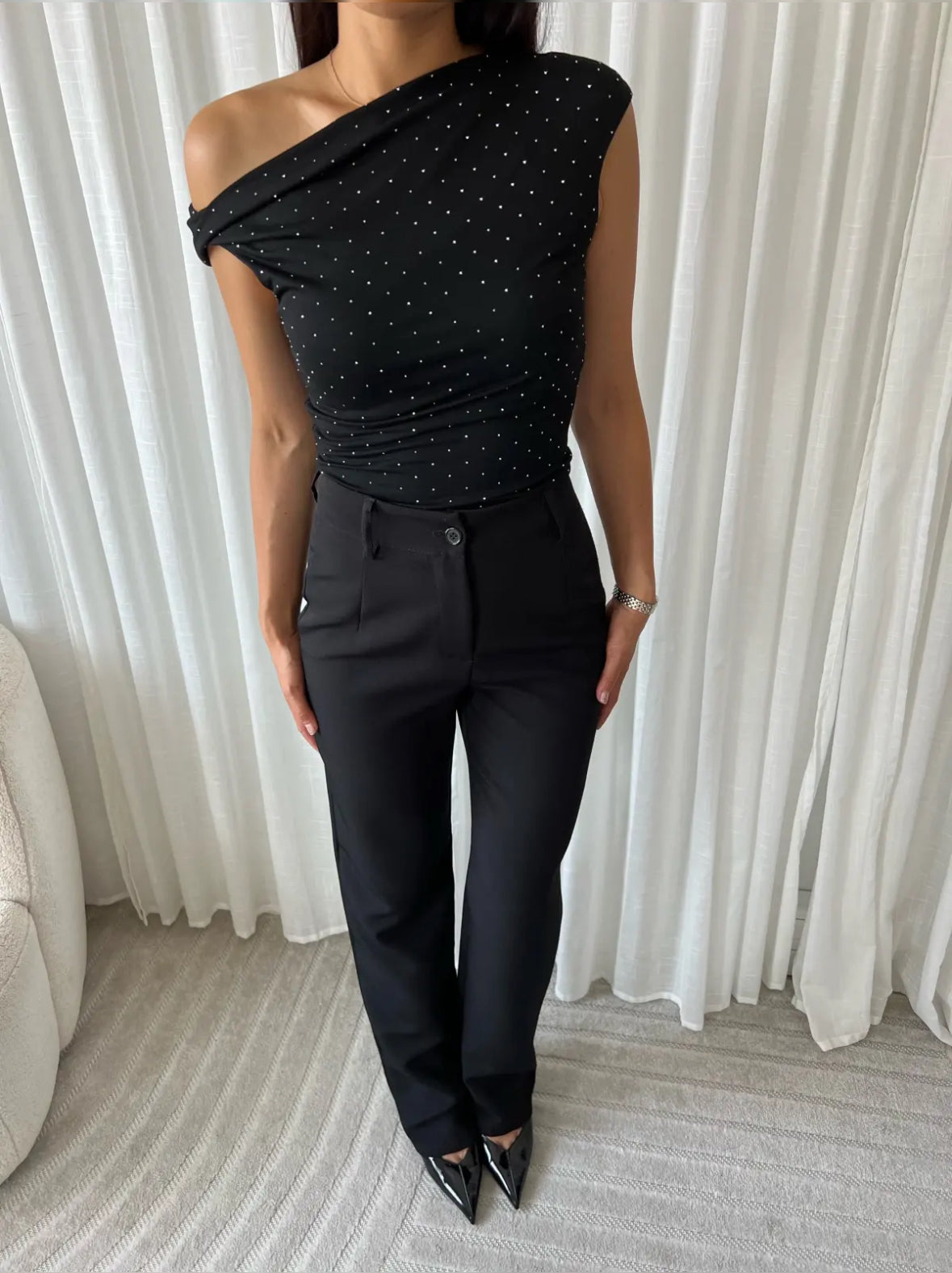 Eksklusiv top med smukke sten og et moderne skråt snit foroven, der giver et elegant og unikt udtryk. Det bløde og strækbare materiale (95% Viscose, 5% Elasthane) sikrer en perfekt og komfortabel pasform.