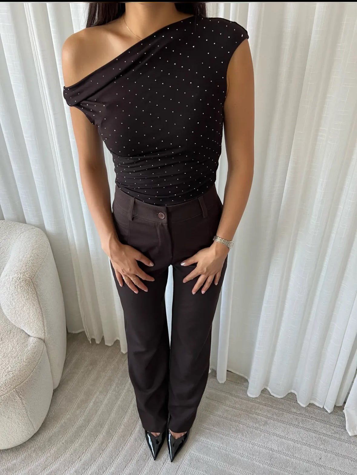 Eksklusiv top med smukke sten og et moderne skråt snit foroven, der giver et elegant og unikt udtryk. Det bløde og strækbare materiale (95% Viscose, 5% Elasthane) sikrer en perfekt og komfortabel pasform.