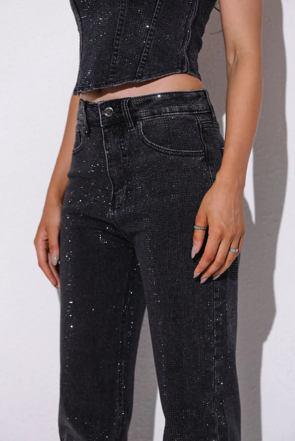 Denim bukser fyldt med sten. Kombiner den med en af vores andre glitter items for at komplet glitter outfit, eller med vores eight Paris kollektion for et mere dæmpet eller stilet outfit.
