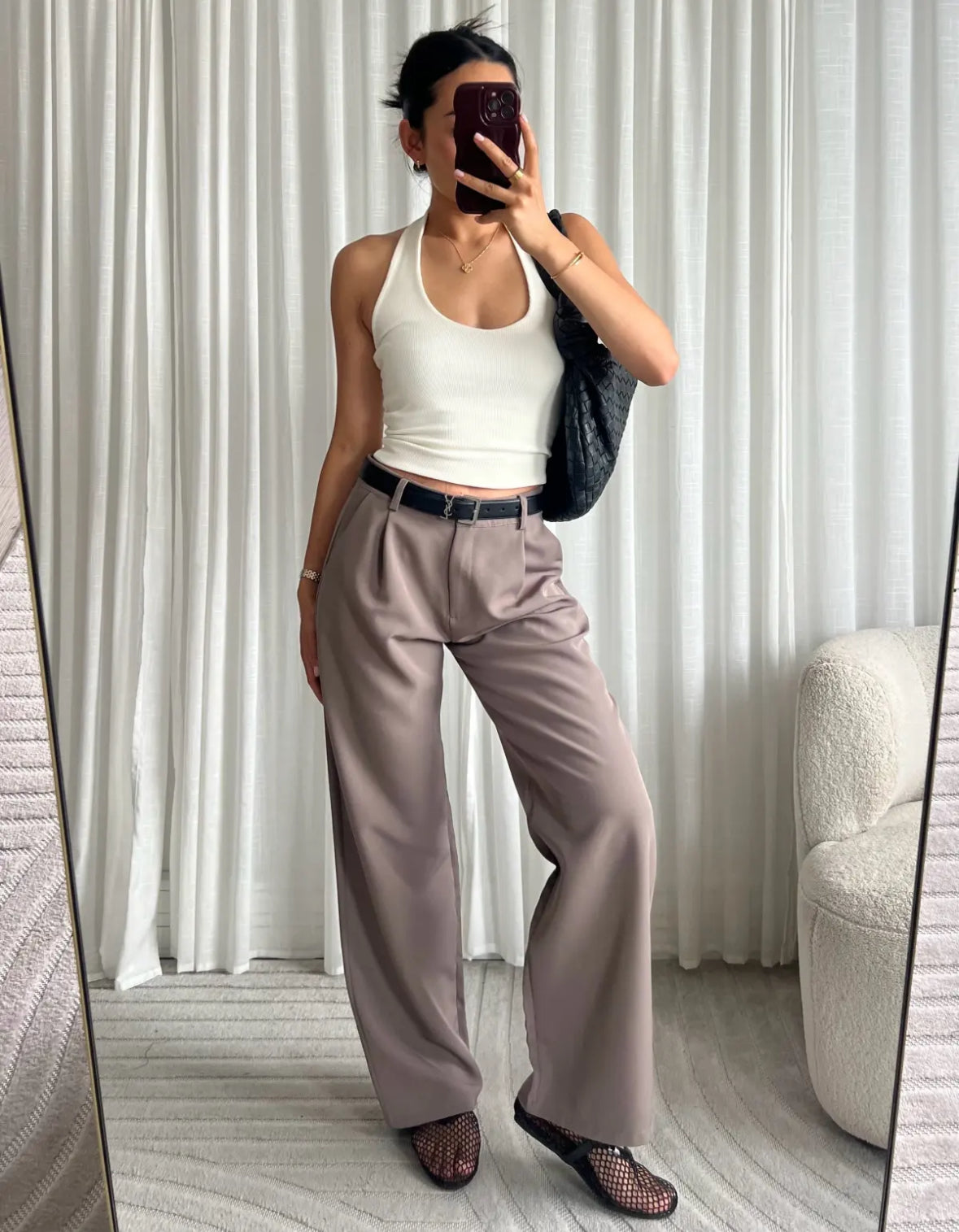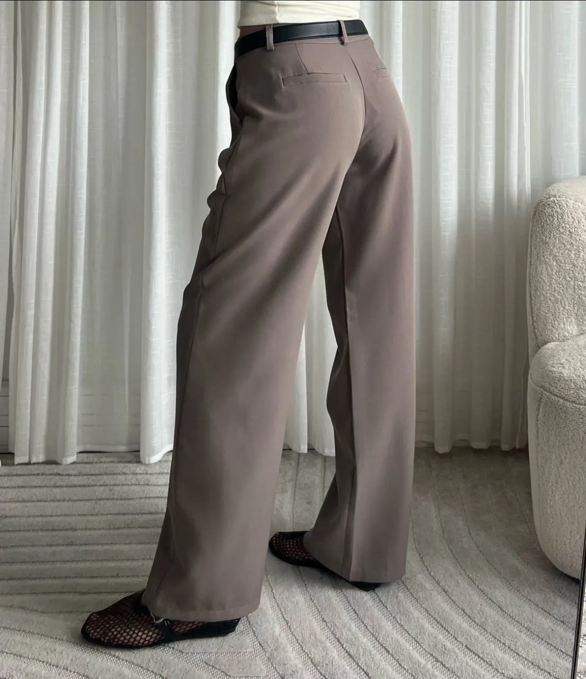 Disse taupe habitbukser er normale i størrelsen og har en elegant mid-rise pasform. De er perfekte til både hverdagen og mere festlige lejligheder, hvor du ønsker et stilrent og klassisk look.