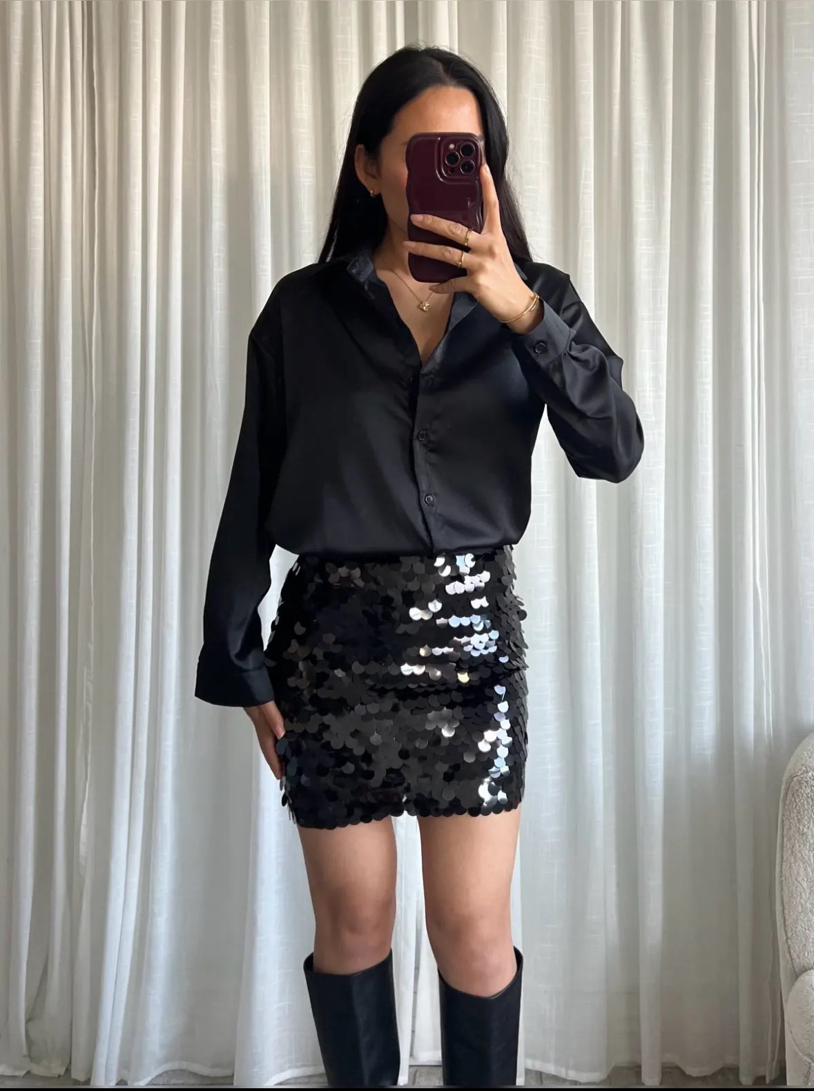 Sort kort nederdel fyldt med glitrende pailletter. Perfekt til festlige lejligheder og aftener i byen.
