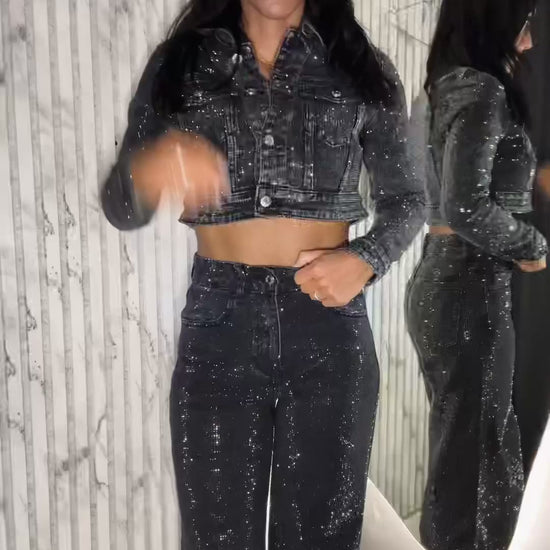 Denne denimjakke med glitter kan styles på utallige måder – brug den over en enkel t-shirt og jeans for et afslappet look, eller kombinér den med en kjole og støvler for et mere festligt outfit.