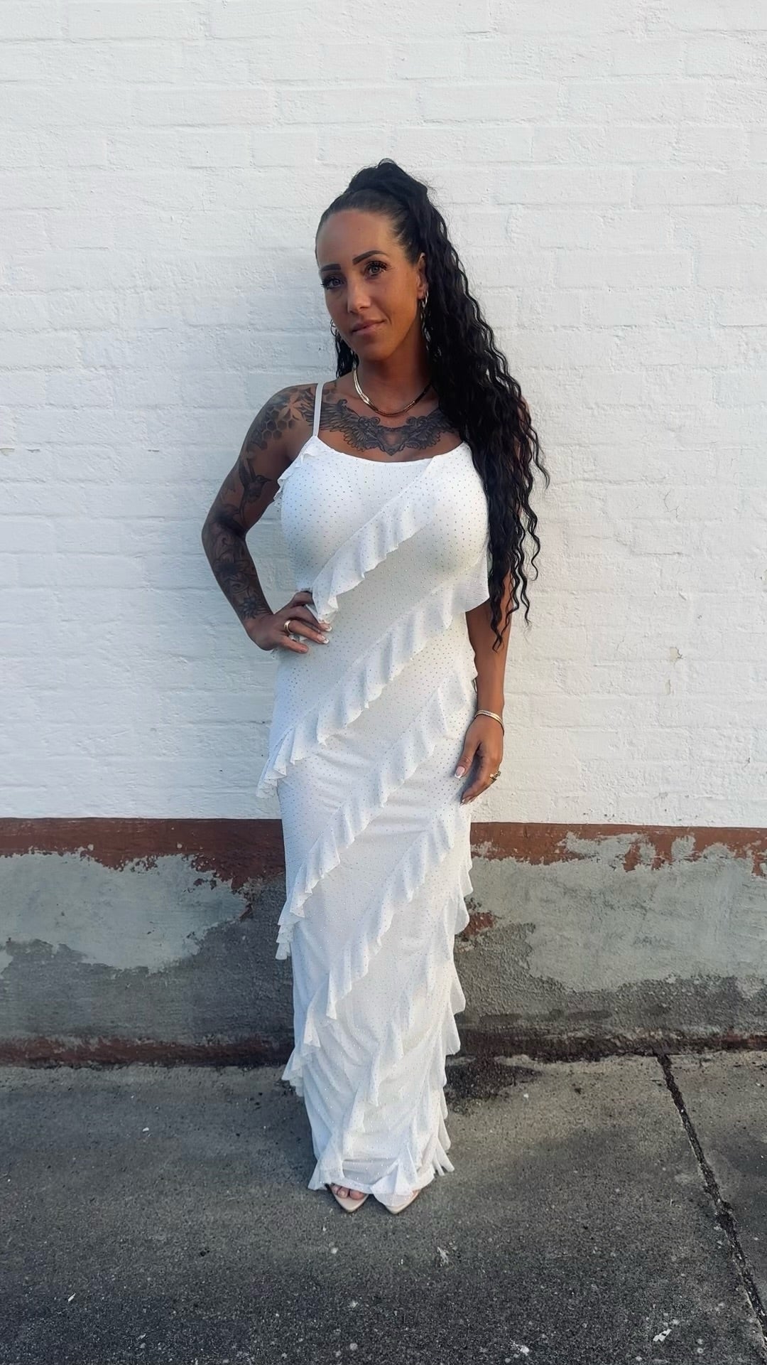 Denne elegante sorte kjole med flæser og skinnende rhinsten er det perfekte valg til dig, der vil have et look, der både er sofistikeret og festligt. De tynde stropper giver et feminint udtryk, mens de iøjnefaldende detaljer med rhinsten får kjolen til at glitre smukt i lyset. Flæserne skaber bevægelse og et flatterende snit, som gør kjolen ideel til alt fra gallafester, bryllupper og konfirmationer til en aften i byen.
