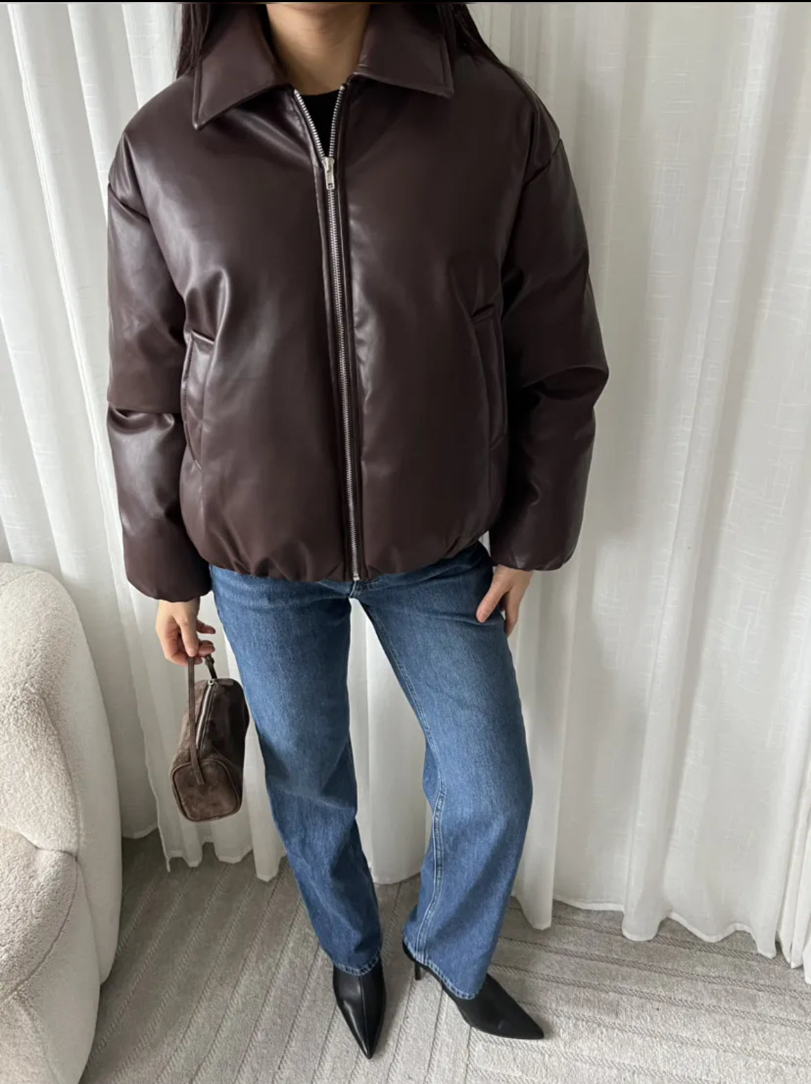 Stilfuld brun puff bomber jakke i polyester og PU. Let, varm og komfortabel – perfekt til efterår og vinter.