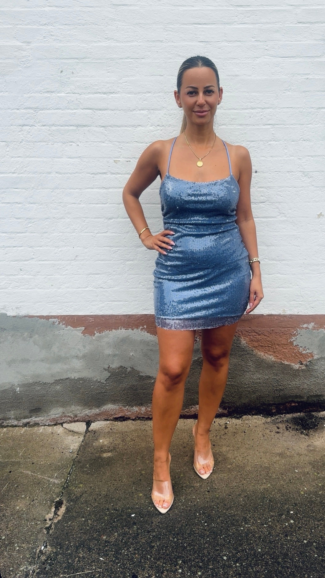 Denne fantastiske blå palliet kjole er det ultimative statement piece til festlige begivenheder. De smukke blå pallietterne fanger lyset og skaber en strålende, glamourøs effekt der garanteret gør dig til midtpunkt.