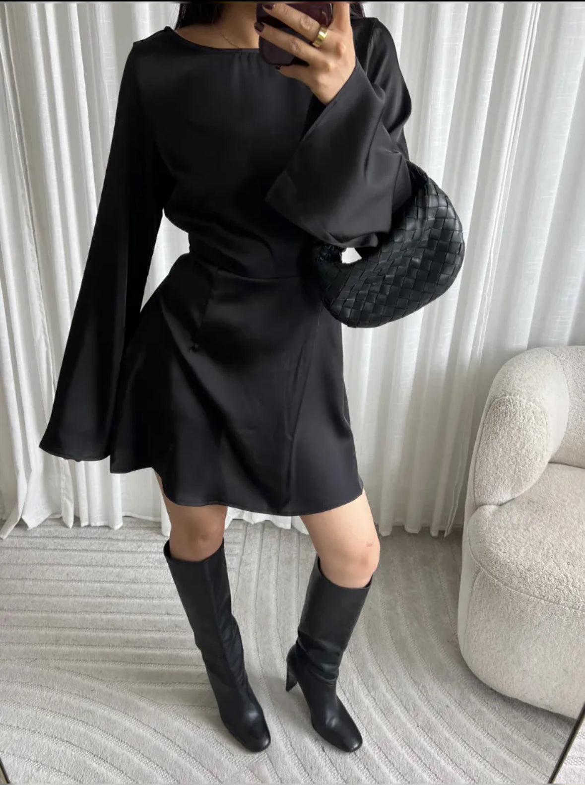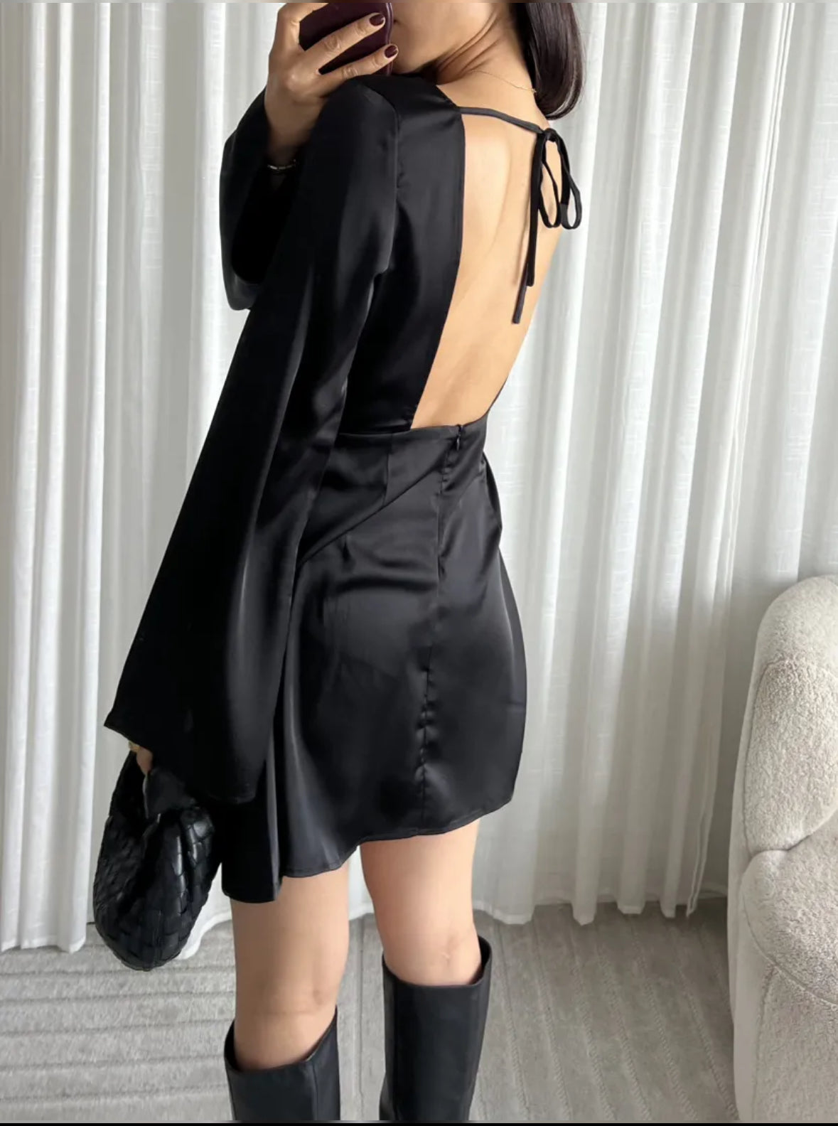 Elegant satin kjole med åben ryg, designet i et smukt, glansfuldt materiale. Kjolen har let løse ærmer, der giver et feminint fald, og bindes elegant i nakken for et sofistikeret og justerbart fit. Perfekt til både festlige anledninger og elegante aftener.