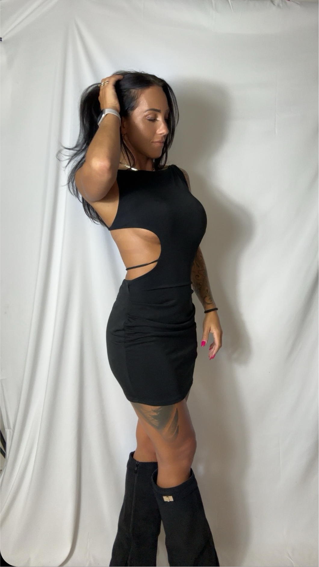 Denne smukke Satira kort kjole kombinerer klassisk elegance med moderne, forførende detaljer. Den åbne ryg skaber en feminin og sofistikeret silhuet, mens den korte længde giver en legende og ungdommelig udstråling.