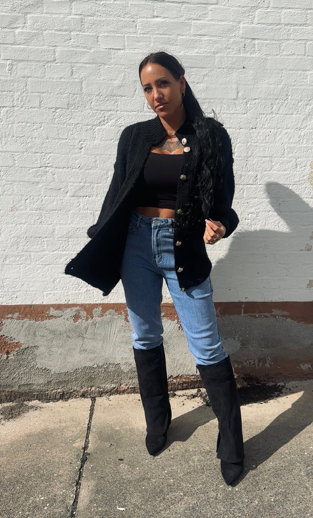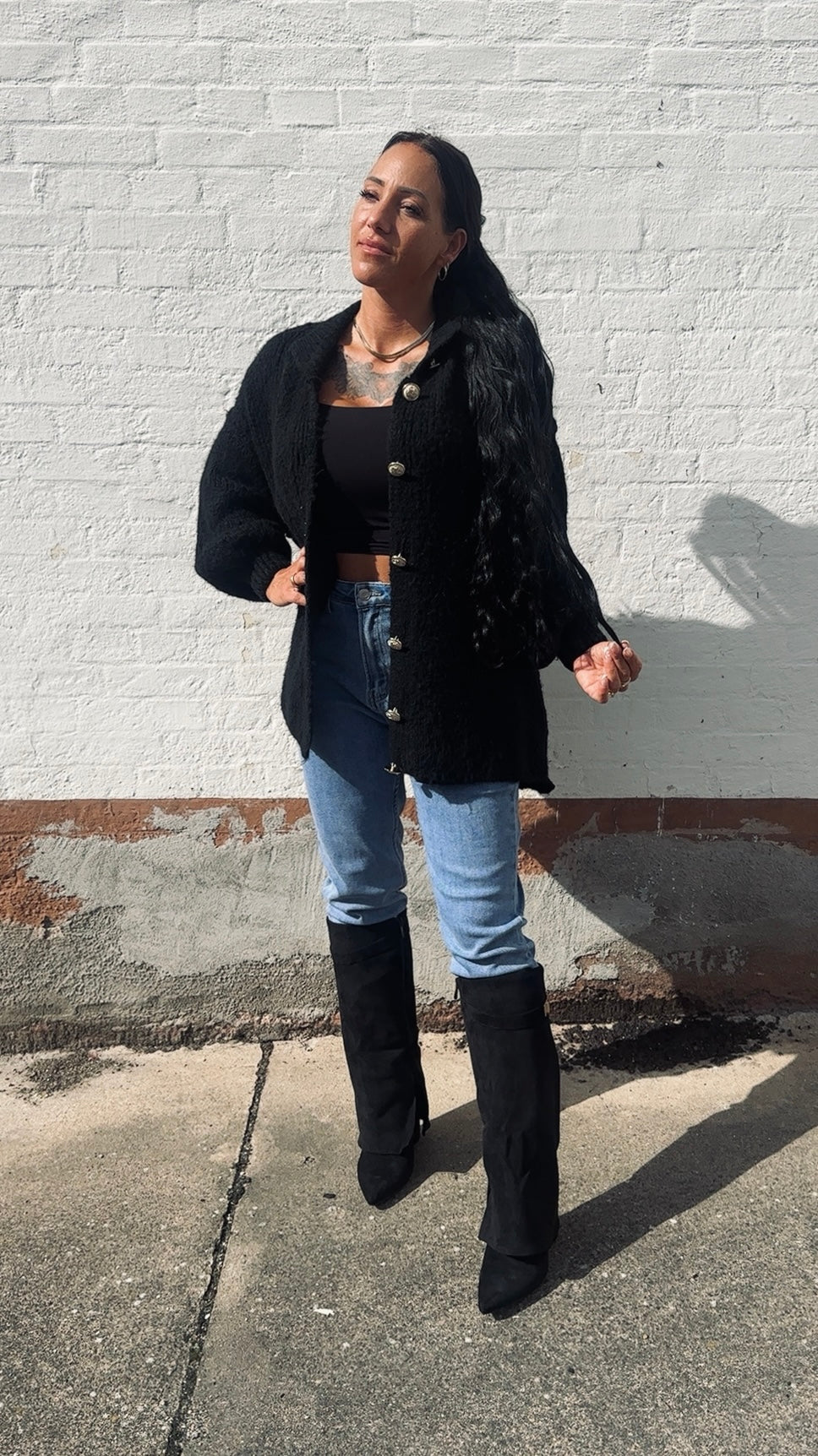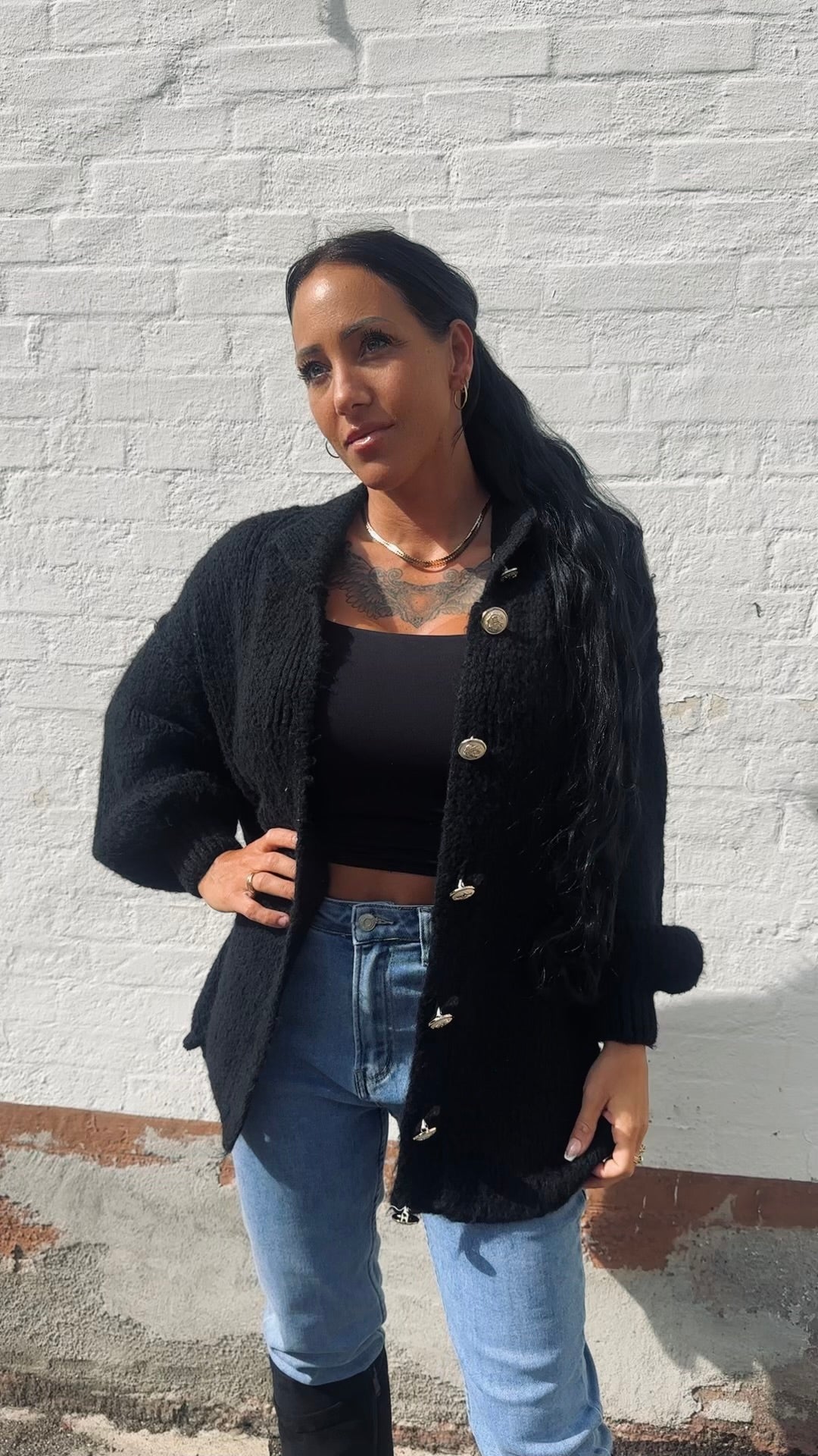 Denne smukke strikkede vest er den perfekte kombination af komfort og stil. Med sine elegante guldknapper tilføjer den et sofistikeret touch til ethvert outfit.